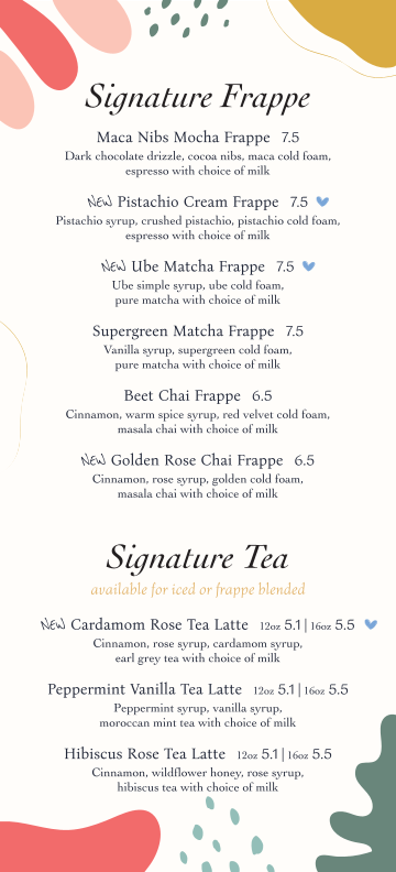 Cinnamon, rose syrup, golden cold foam, masala chai with choice of milk